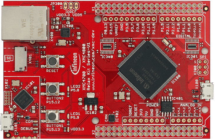 The XMC4700 Relax Kit is an XMC4700 based microcontroller evaluation kit with Ethernet connection, CAN node and microSD Card slot included. It is hardware compatible with 3.3V Arduino Shields.