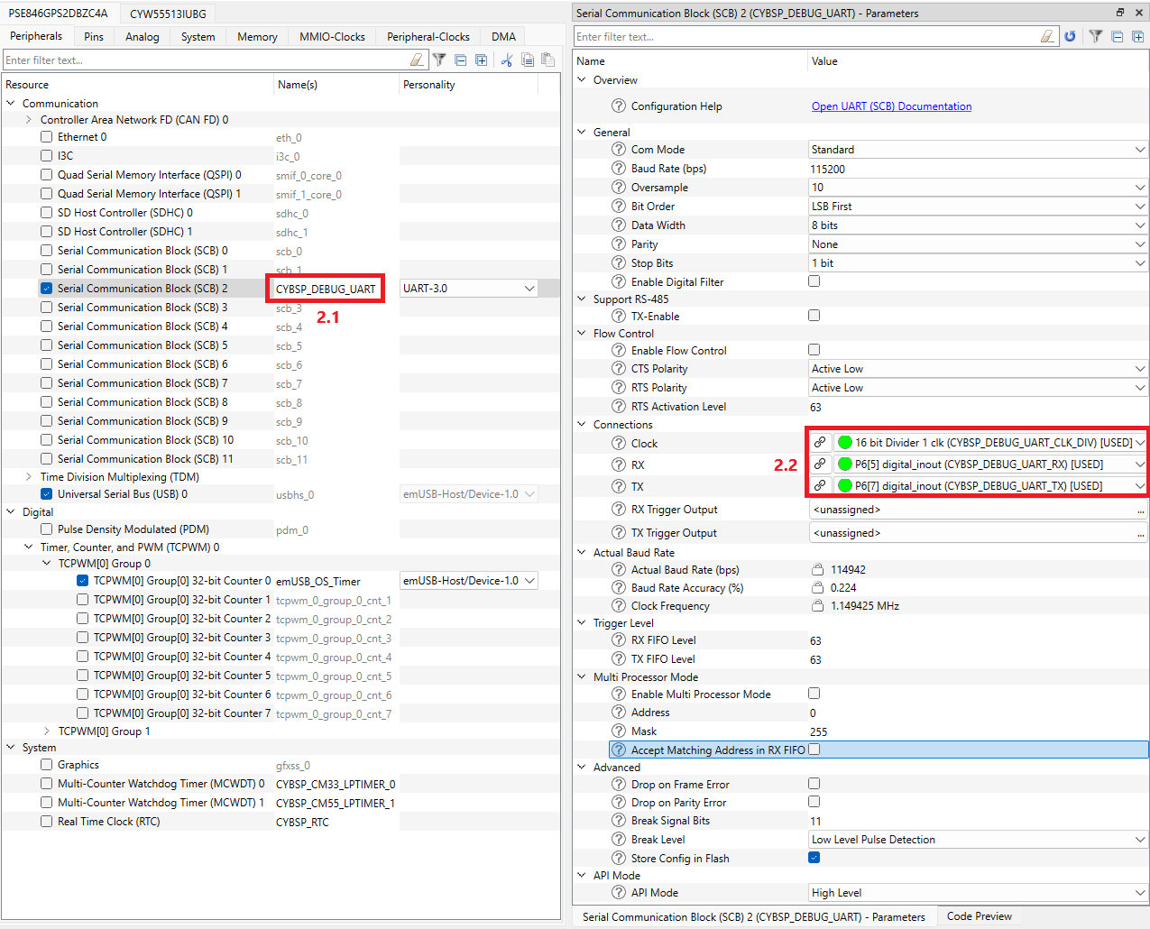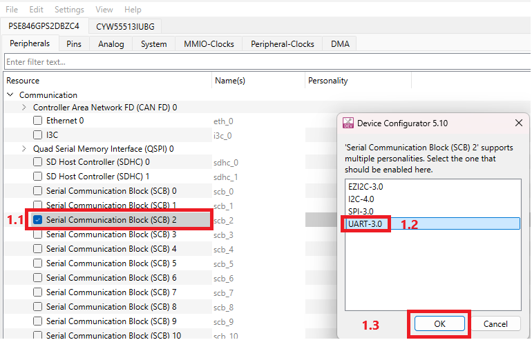 - Launch the ModusToolbox Device Configurator and switch to the Peripherals tab (#1.1).