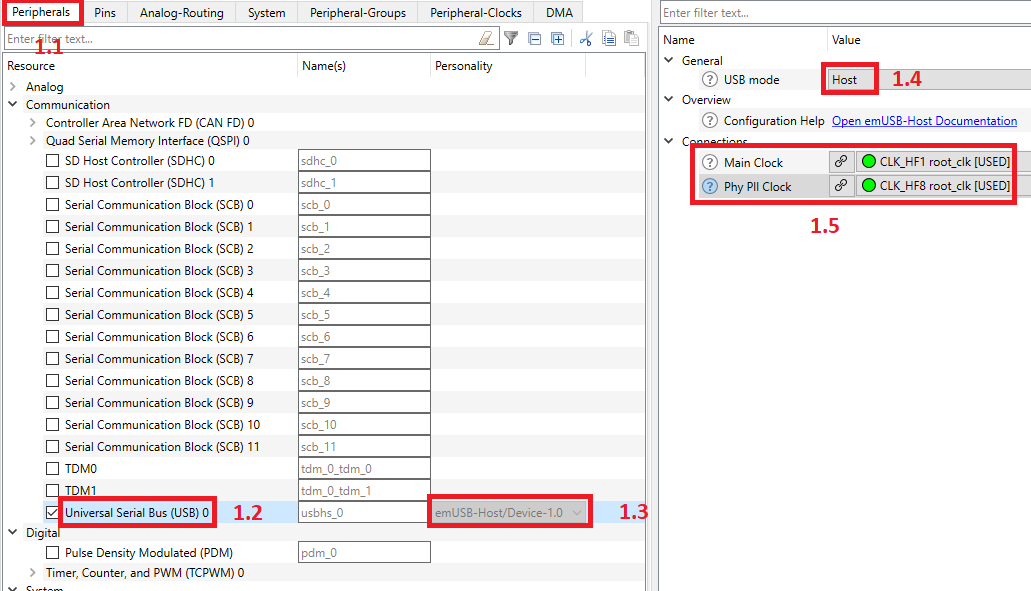 Also, the emUSB-Host/Device personality is present in the Device-configurator for simplify routine of configuration clocks and pins for USB IP block operation. The personality is a part of mtb-device-support-pse8xxgp for PSE84 devices.