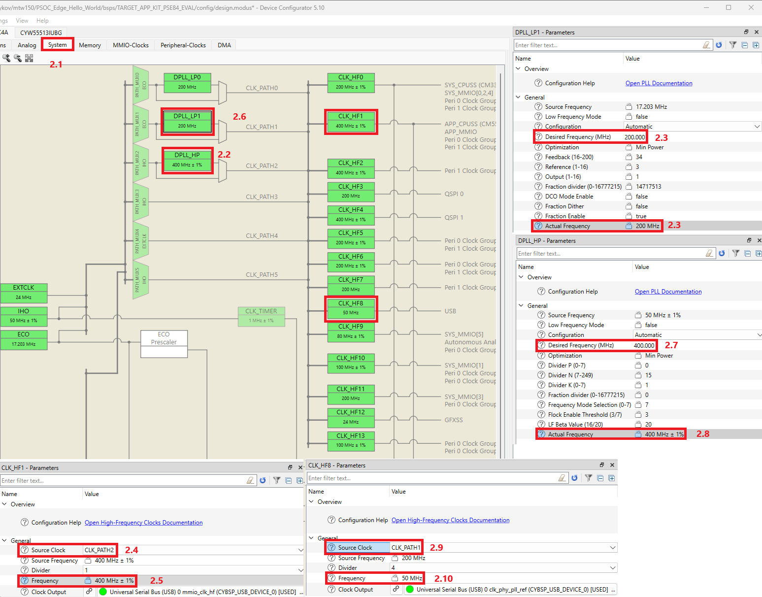 - Select CLK_PATH2 as the source clock for CLK_HF1 (#2.4). Ensure that CLK_HF1 has the frequency of 400 MHz (#2.5).