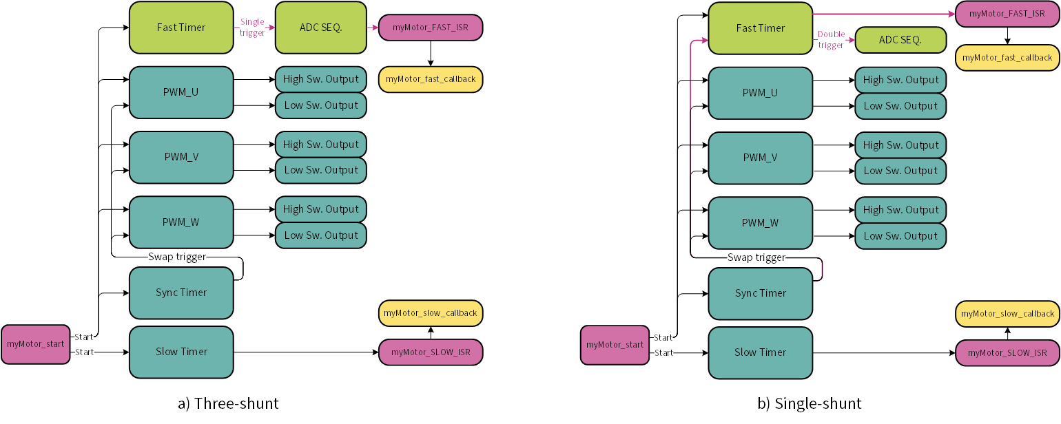 The Motor Control instance resource interconnection depends on the selected measurement scheme. The difference is highlighted in the picture below.