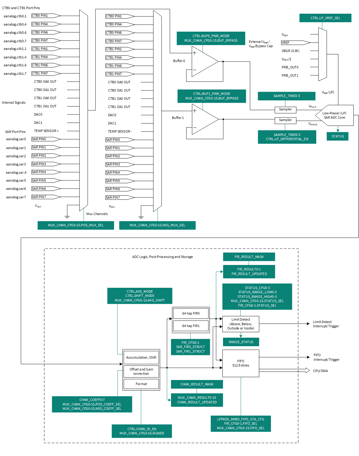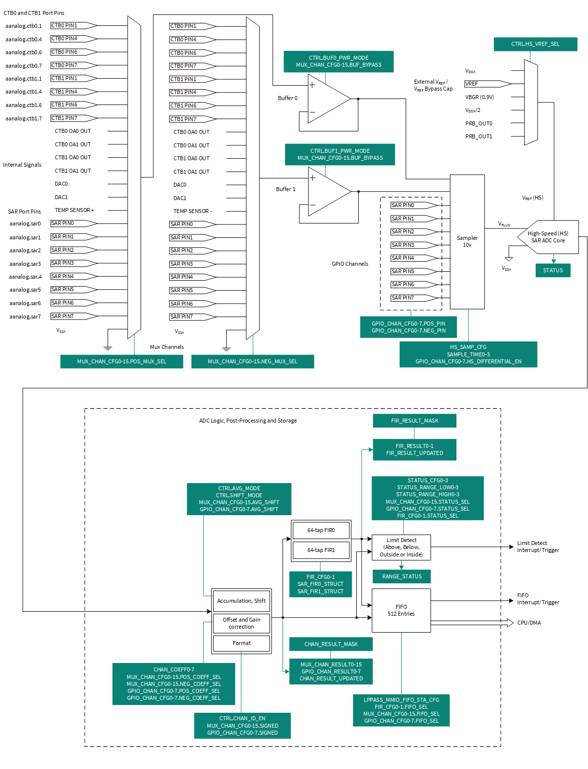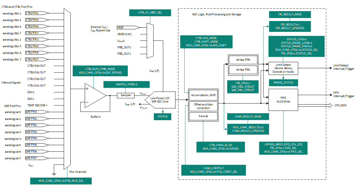 The versatile SAR ADC is an analog-to-digital converter with a dual-core 12-bit successive approximation register. The SAR ADC (hereafter ADC) contains a High Speed (HS) Core that can operate in Active mode with the SRSS clock up to 80 MHz and a Low Power (LP) Core based on the 4.096 MHz LPOSC from the Autonomous Analog. The HS Core is not available in DeepSleep while the LP Core is available in all power modes.