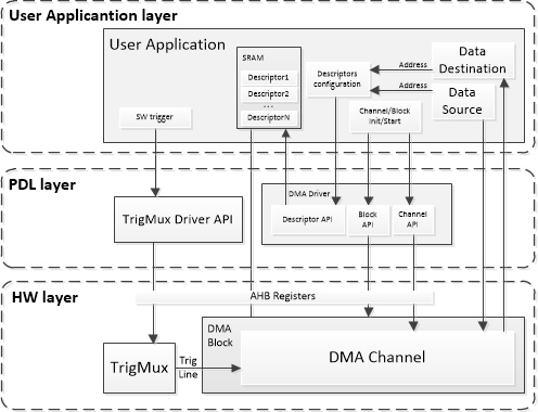The following is a simplified structure of the DMA driver API interdependencies in a typical user application: