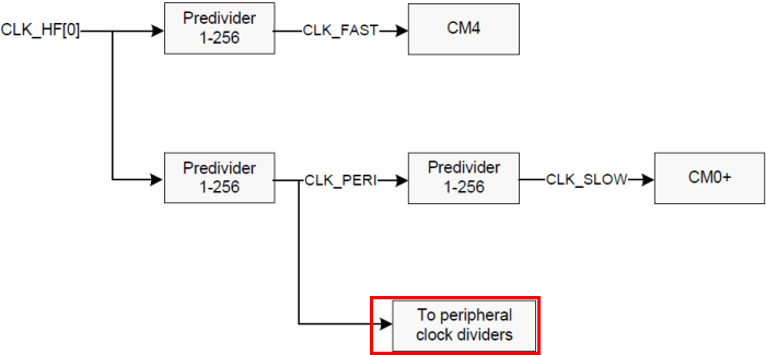 The SysClk driver also supports phase aligning two peripheral clock dividers using Cy_SysClk_PeriphEnablePhaseAlignDivider(). Alignment works for both integer and fractional dividers. The divider to which a second divider is aligned must already be enabled.
