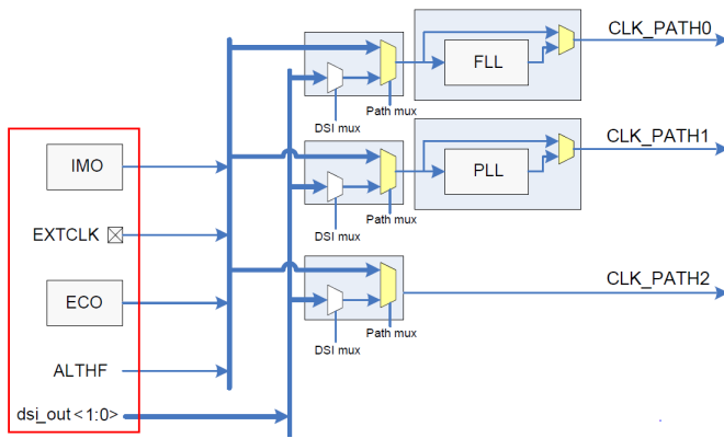 Some clock paths such as path 0 and path 1 have additional resources that can be utilized to provide a higher frequency clock. For example, path 0 source clock can be used as the reference clock for the FLL and path 1 source clock can be used as the reference clock for the PLL.